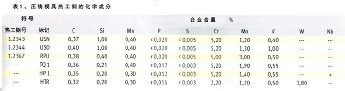 表1所列除了三種材料號為1.2343,1.2344、1.2367常用熱工鋼的化學成分,還列了特種材料為TQ、HP及HTR熱工鋼的化學成分。在所有情況下,涉及的是主要合金元素為鉻、鉬及釩的馬氏體熱工鋼;主要合金元素是以電解再熔工藝(ESU)生產的。